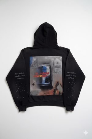 اللون والملمس: أسود فحمي مغسول (Faded/Washed Black)، مما يمنحه مظهرًا عتيقًا (Vintage) وملمسًا ناعمًا ومريحًا. التصميم والقصة: سترة بقبعة (هودي) بتصميم فضفاض وواسع (Oversized Fit) وعصري.